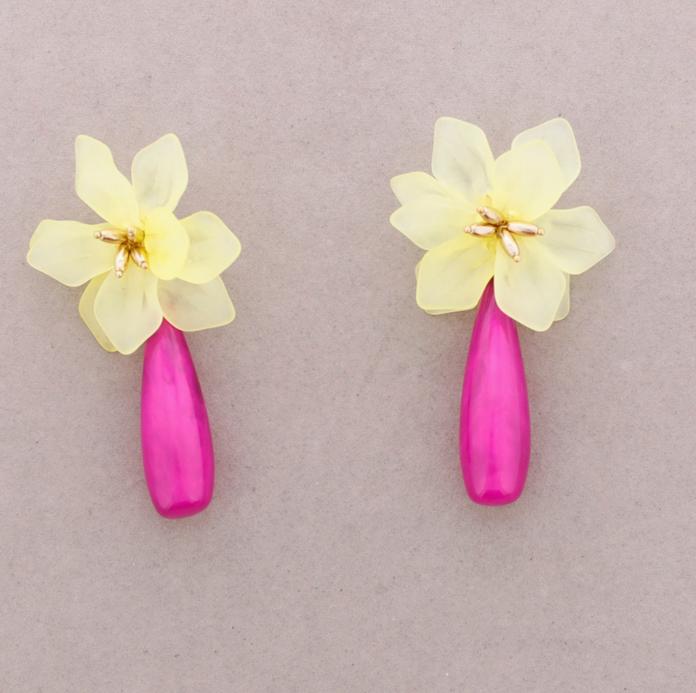 Gardenia earrings are an ode to femininity and discreet sophistication. This design features a flower with translucent and satiny petals, with a detailed center in golden tones that simulates natural stamens. Yes base yes flower, a drop-shaped pendant with a iridescent pearlescent finish, that reflects light softly and gracefully.
