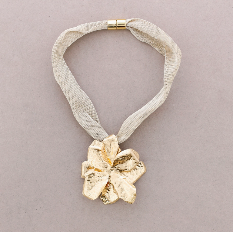 The Blossom Necklace is a bold design piece that redefines the concept of modern elegance. This choker is made in a flexible black tubular mesh, fits comfortably around the neck, creating a minimalist base for the true protagonist: one large gold floral pendant.
