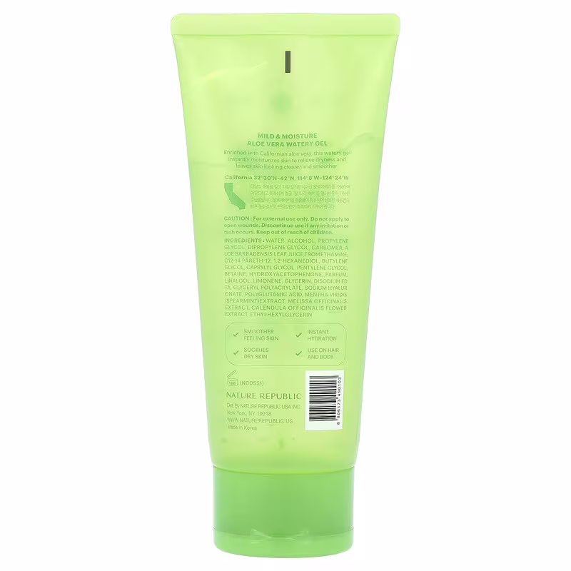 Contain 92% of sc. Aloaceretion Filtrate P. Contains California aloe vera that moisturizes gently and provides soothing to the body. Helps in case of sunburn and can be kept in the refrigerator for absolute freshness.
