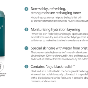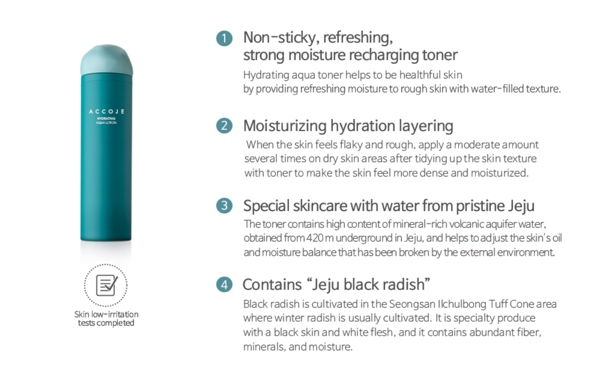O Hydrating Aqua Toner da ACCOJE é um tónico leve e refrescante, formulado para repor hidratação, suavizar a pele e preparar para os passos seguintes da rotina de skincare. Enriquecido com extratos naturais da ilha de Jeju, como rabanete negro, aloe vera, cacto e algas marinhas, ajuda a nutrir, acalmar e revitalizar peles desidratadas ou sensibilizadas. A sua textura aquosa de rápida absorção proporciona uma sensação de frescura e conforto.