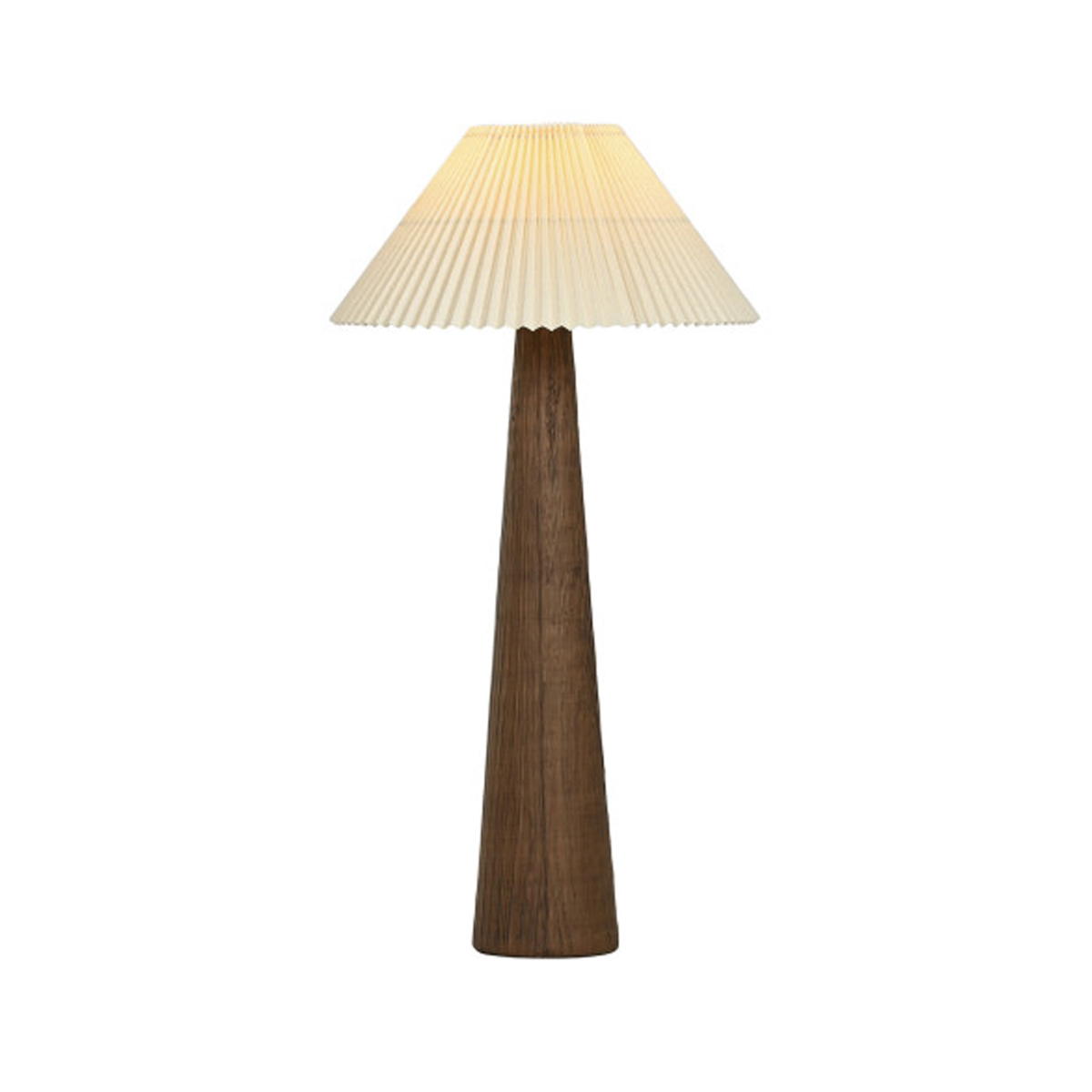 Este candeeiro de chão em madeira com abat-jour plissado combina design contemporâneo com elegância intemporal. A base em madeira escura transmite robustez e carácter natural, enquanto a cúpula plissada em tom neutro difunde a luz de forma suave e acolhedora.