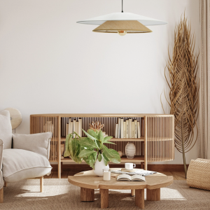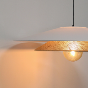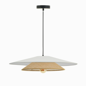Descubra a originalidade contemporânea da nossa suspensão BOOMERANG, um candeeiro único que sobrepõe com elegância duas cúpulas cônicas: uma em algodão branco e outra em sisal natural.