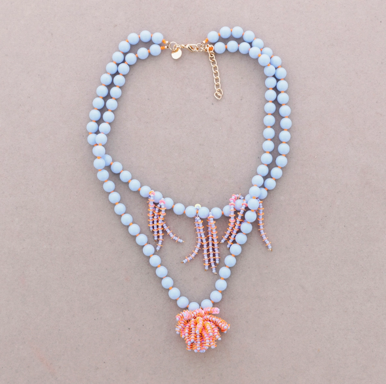O Colar Coral Breeze é uma celebração da cor e da criatividade. Composto por duas voltas de contas esféricas em azul lavanda suave, esta peça destaca-se pelos seus detalhes únicos: pequenos pendentes suspensos que evocam a fluidez das anémonas e um pendente central volumoso, meticulosamente trabalhado em tons de laranja coral e lavanda.