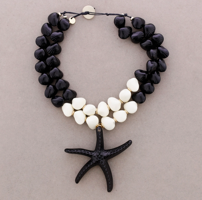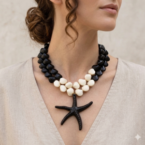 O protagonista indiscutível é o grande pendente de estrela do mar preta, com uma textura tátil e detalhada, que ancora toda a peça com um toque de mistério e elegância escultural. É o acessório ideal para uma mulher com uma presença forte e um gosto apurado pelo design contemporâneo.