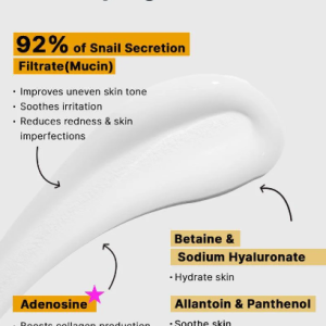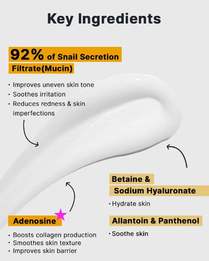Snail Secretion Filtrate, Betaine, Caprylic/Capric Triglyceride, Butylene Glycol, Cetearyl Olivate, Sorbitan Olivate, Cetearyl Alcohol, Carbomer, Ethylhexanediol, Phenoxyethanol, Arginine, Dimethicone, Sodium Polyacrylate, Sodium Hyaluronate, Allantoin, Palmitic Acid, Panthenol, Xanthan Gum, Stearic Acid, Adenosine, Aqua/Water, Myristic Acid