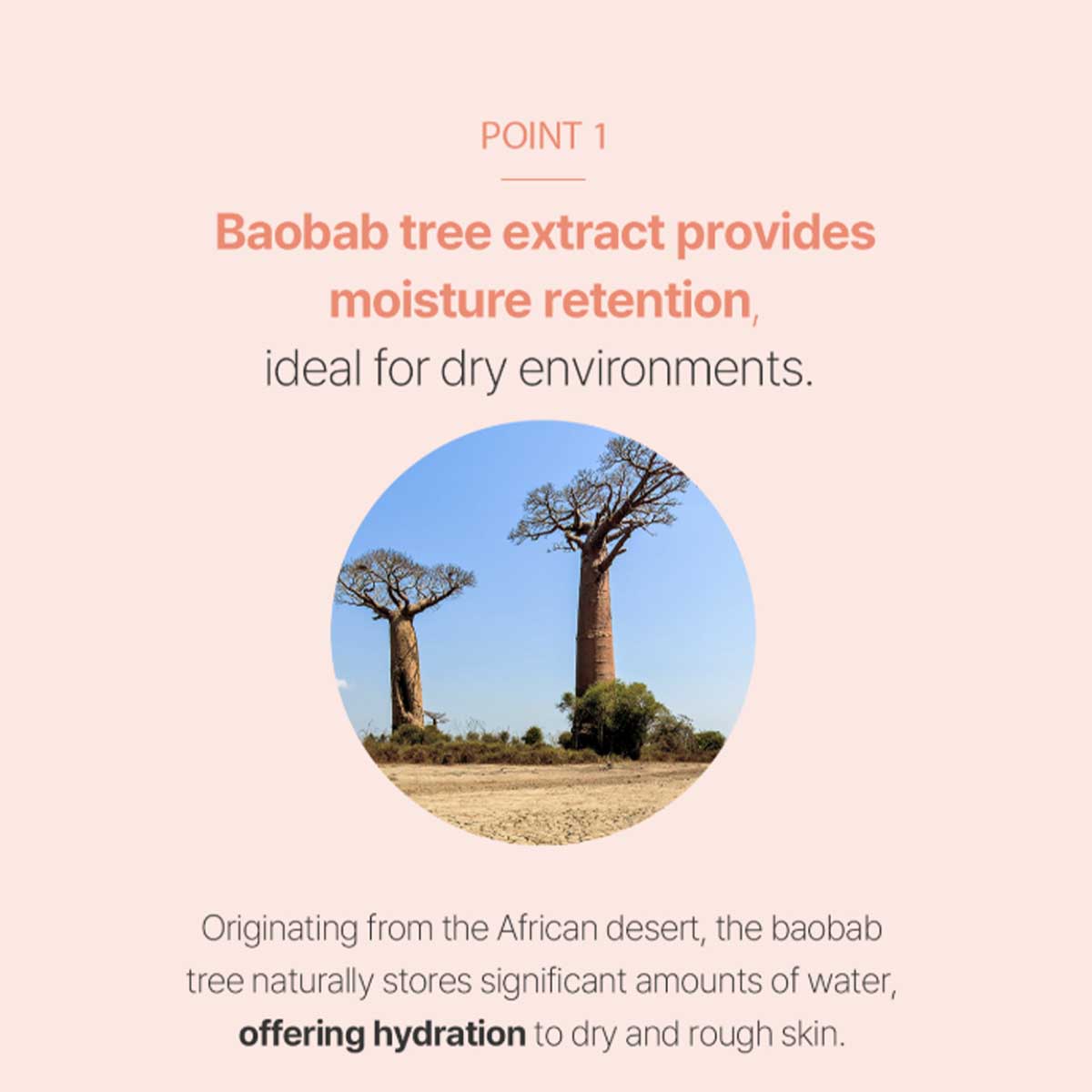 A essência da árvore baobá proporciona uma hidratação profunda e um efeito calmante.