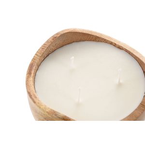 Produzida em recipiente de madeira natural esculpida em formato orgânico, esta vela apresenta três pavios, garantindo uma queima uniforme e intensa, que proporciona uma iluminação aconchegante e uma fragrância envolvente.