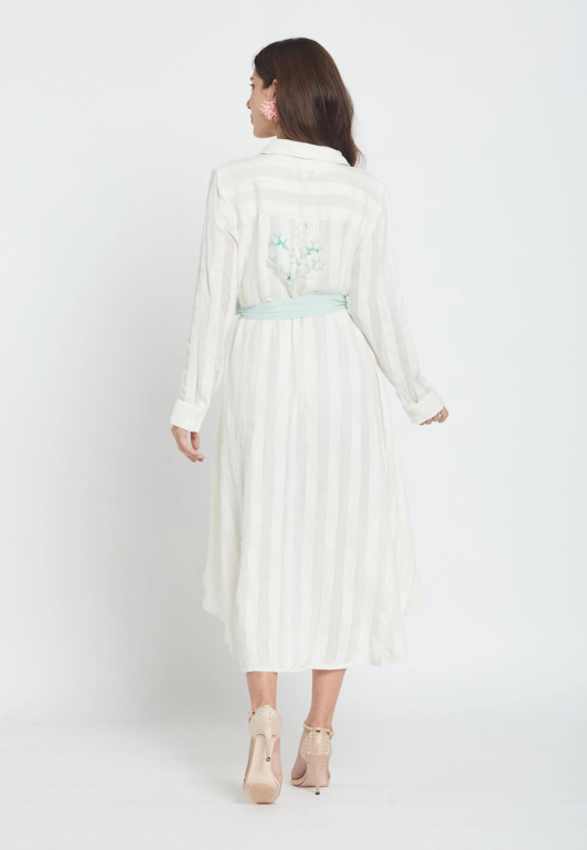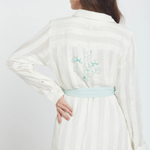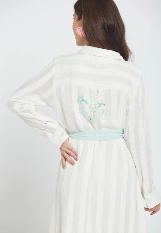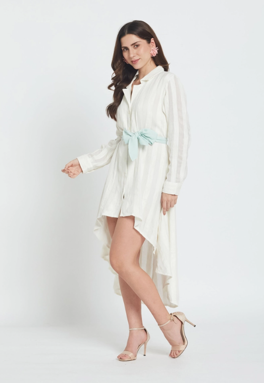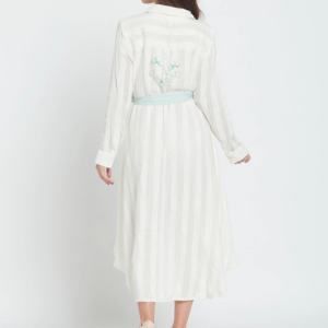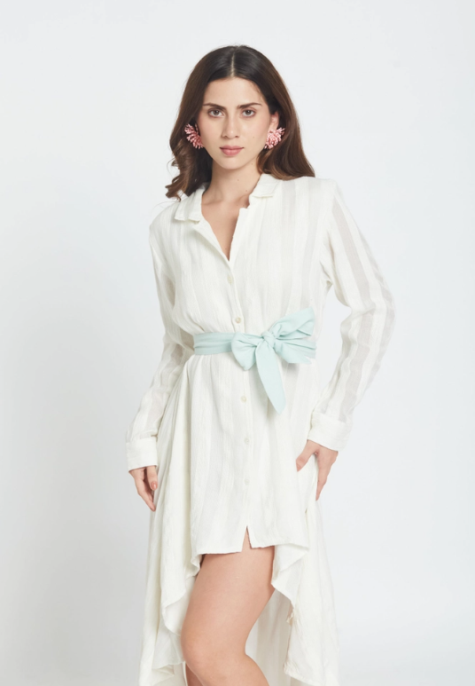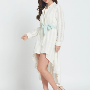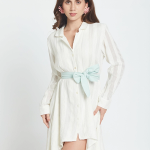 O vestido camiseiro Candela Whitey combina o charme descontraído de um resort com a elegância do dia-a-dia. Esta peça em chiffon transparente apresenta uma barra assimétrica que acompanha os seus movimentos, enquanto uma faixa verde-menta na cintura define a silhueta, proporcionando o toque chique desejado. Perfeito para escapadelas na praia, festas no jardim ou sempre que quiser sentir-se em férias permanentes. Leve e fresco, será a sua nova peça favorita para um look sofisticado sem esforço.